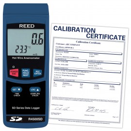 The Reed R4500SD Data Logging Hot Wire Thermo-Anemometer measures air velocity, air temperature and has a built-in contact thermometer. Featuring automatic temperature compensation, Data hold, Max/Min functions, and an easy-to-read backlit LCD display. Using a SD card (max 16GB), a user can manually record up to 99 readings or automatically by selecting a desired sampling rate from 1 to 3600 seconds. Quickly generate an Excel file with raw data, all without the use of software. Optional accessories include a tripod and AC adapter for continuous long-term monitoring.
